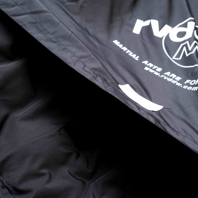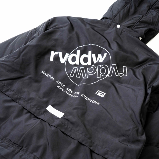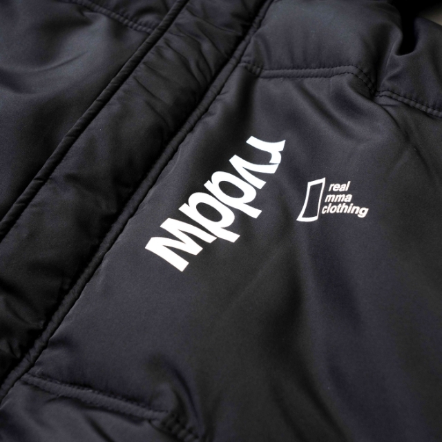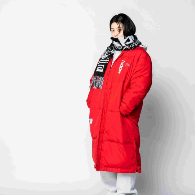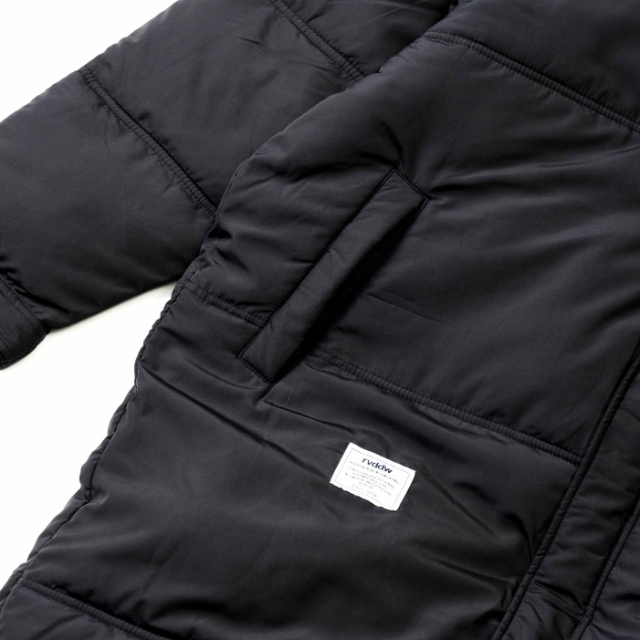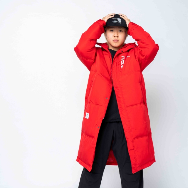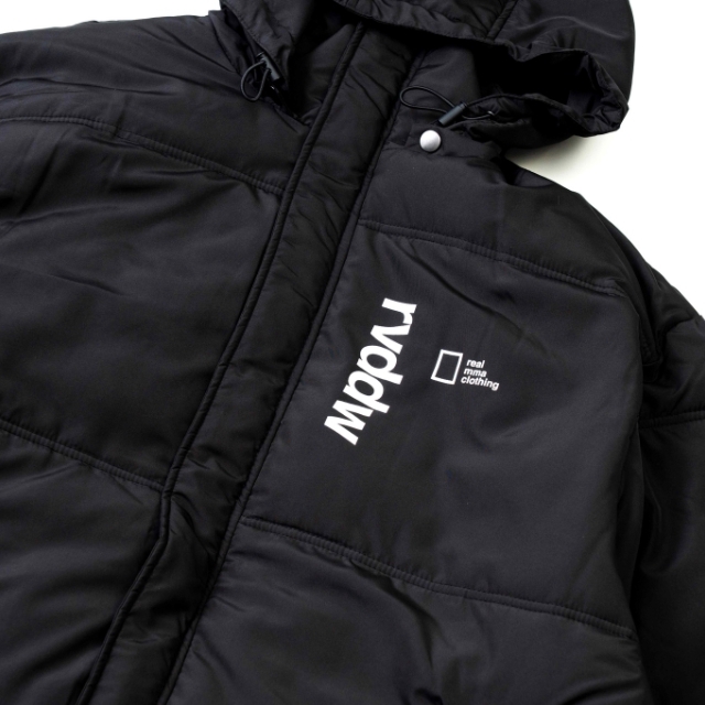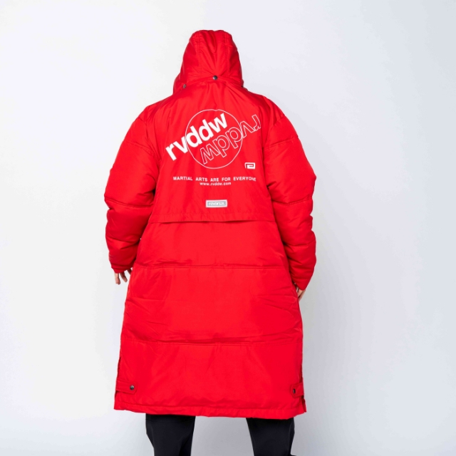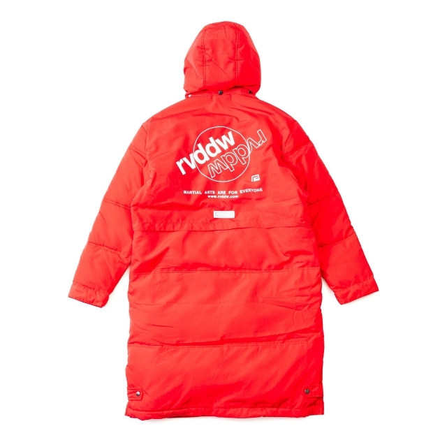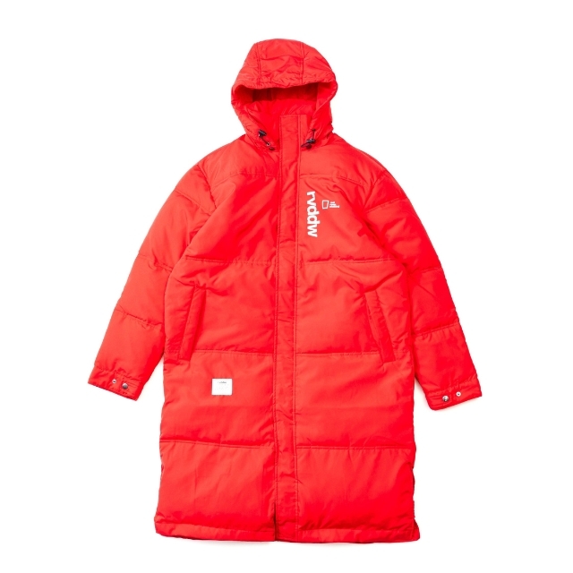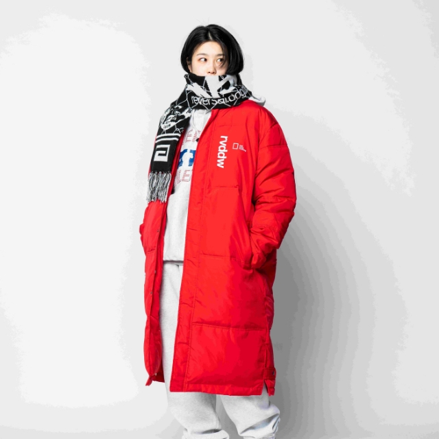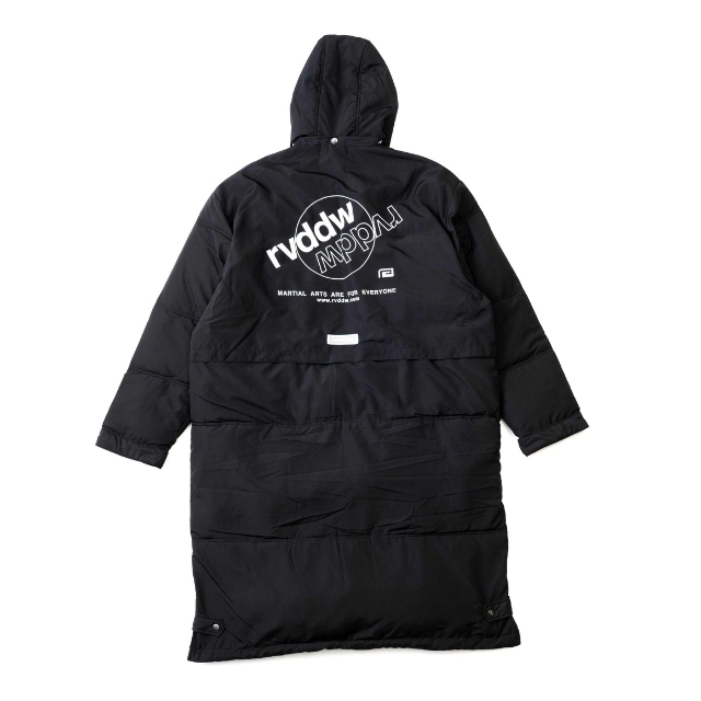 大胆なバックプリントが象徴的な中綿入りベンチコート。
