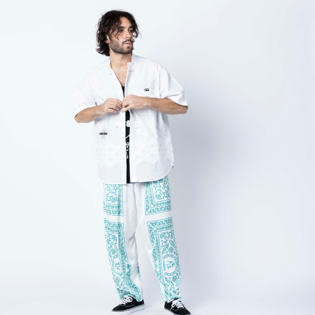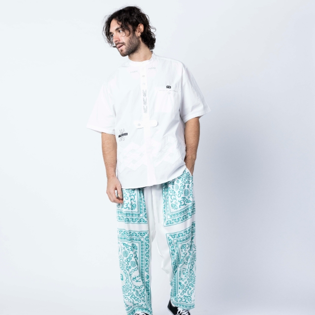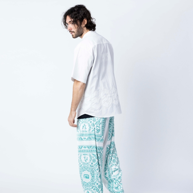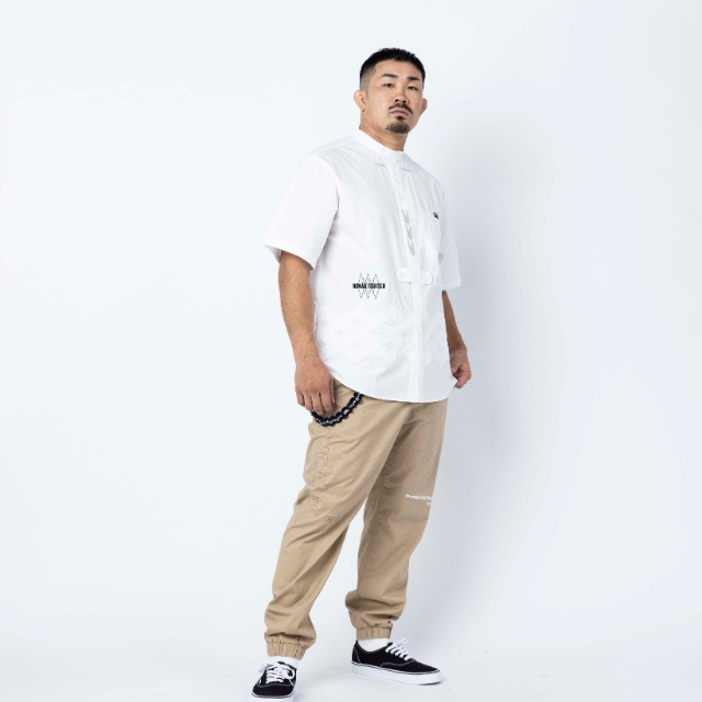 勝守を意味する伝統ある民族柄をさりげない同色刺繍で大胆にパッチワーク。